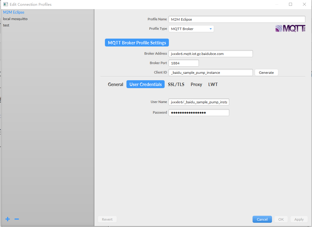 以下是mqtt.fx的配置。其中address是云服务器的地址。端口为对应的不同服务模式端口。1883端口一般基于无账号密码的服务。1884一般对应需要账号密码的加密服务。账号密码,在服务器配置模型后会返回。USERID是服务器配置的模型.接下来介绍服务器配置