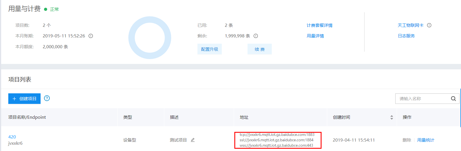 创建设备项目后。返回的地址就是上面说的address地址。后面的数字就是对应的端口。