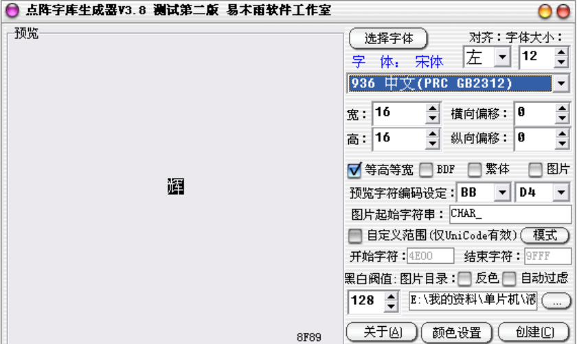 字库的生成,我们要用到一款软件,由易木雨软件工作室设计的点阵字库生成器 V3.8。该 软件可以在 WINDOWS 系统下生成任意点阵大小的 ASCII,GB2312(简体中文)、GBK(简体中 文)、BIG5(繁体中文)、HANGUL(韩文)、SJIS(日文)、Unicode 以及泰文,越南文、俄文、乌克 兰文,拉丁文,8859 系列等共二十几种编码的字库,不但支持生成二进制文件格式的文件,也 可以生成 BDF 文件,还支持生成图片功能,并支持横向,纵向等多种扫描方式,且扫描方式 可以根据用户的需求进行增加。