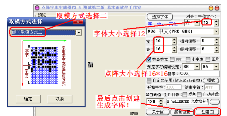 要生成 16*16 的 GBK 字库,则选择:936 中文 PRC GBK,字宽和高均选择 16,字体大小 选择 12,然后模式选择纵向取模方式二(字节高位在前,低位在后),最后点击创建,就可以 开始生成我们需要的字库了(.DZK 文件)