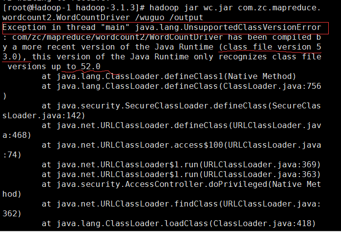 将jar包导入到Hadoop集群中。使用Hadoop命令执行jar包,出现如下错误: