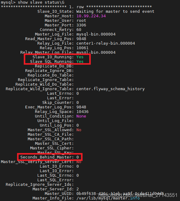 (3)我们在从库里边执行如下命令。里边配置设置了master的主机名,主机端口号,主机用户名,密码,主机器的文件名字以及位置。