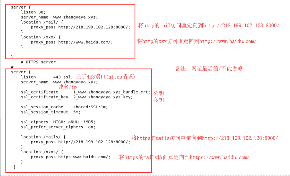 这里这是举了一个很简单的样例,便于理解。如果要重定向图片,需要使用通配符,这个资料很多,不再赘述。另外,证书去网上申请,都是免费的,大概10分钟就好了,我这个是在腾讯云申请的,不要用自己生成的,这样在谷歌浏览器访问的时候会显示证书不完全/无效,或者连接不安全等问题。