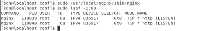 也可能是后台运行了好几个nginx,一般正常运行后,只有两个进程,用sudo lsof -i:80查看,把多余的杀掉,或者全部杀掉,再重新启动,如下图: