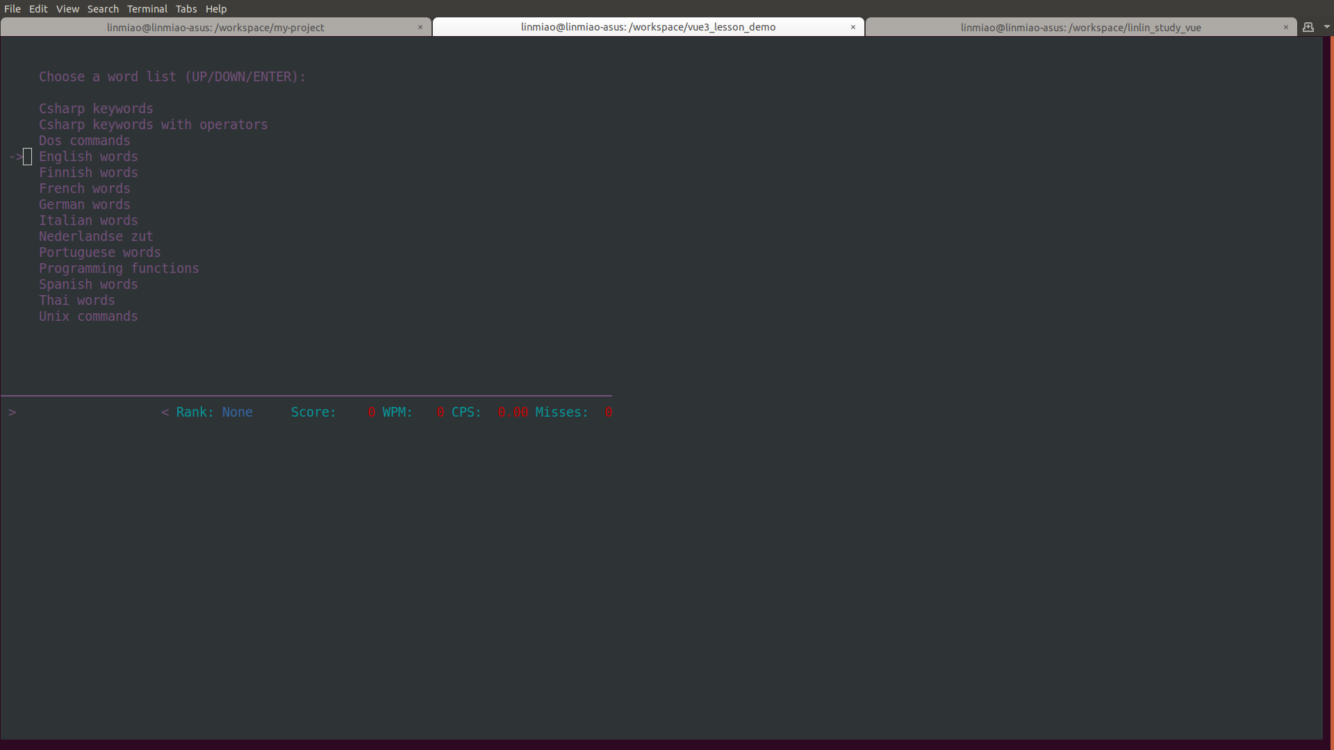 然后直接输入命令 typespeed就可以运行打字游戏