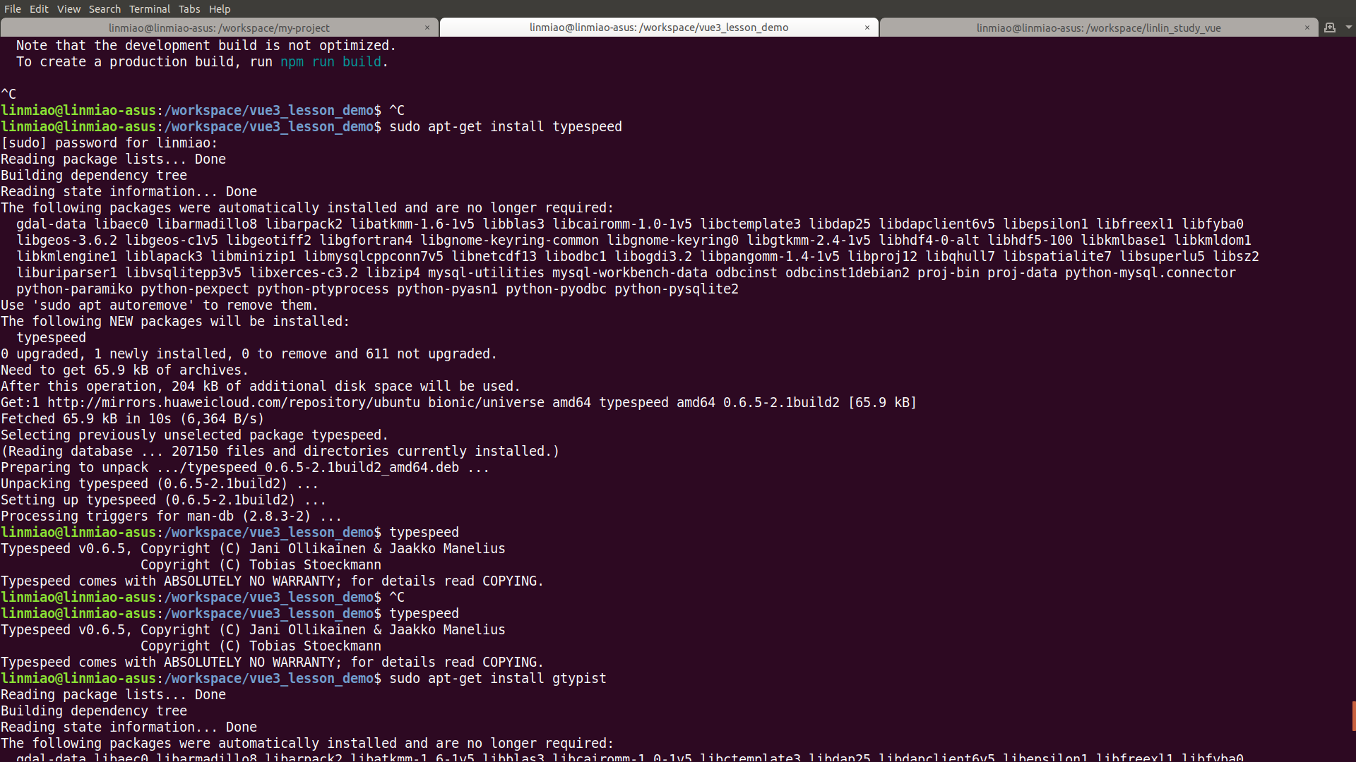 在命令行直接输入命令: sudo apt-get install typespeed