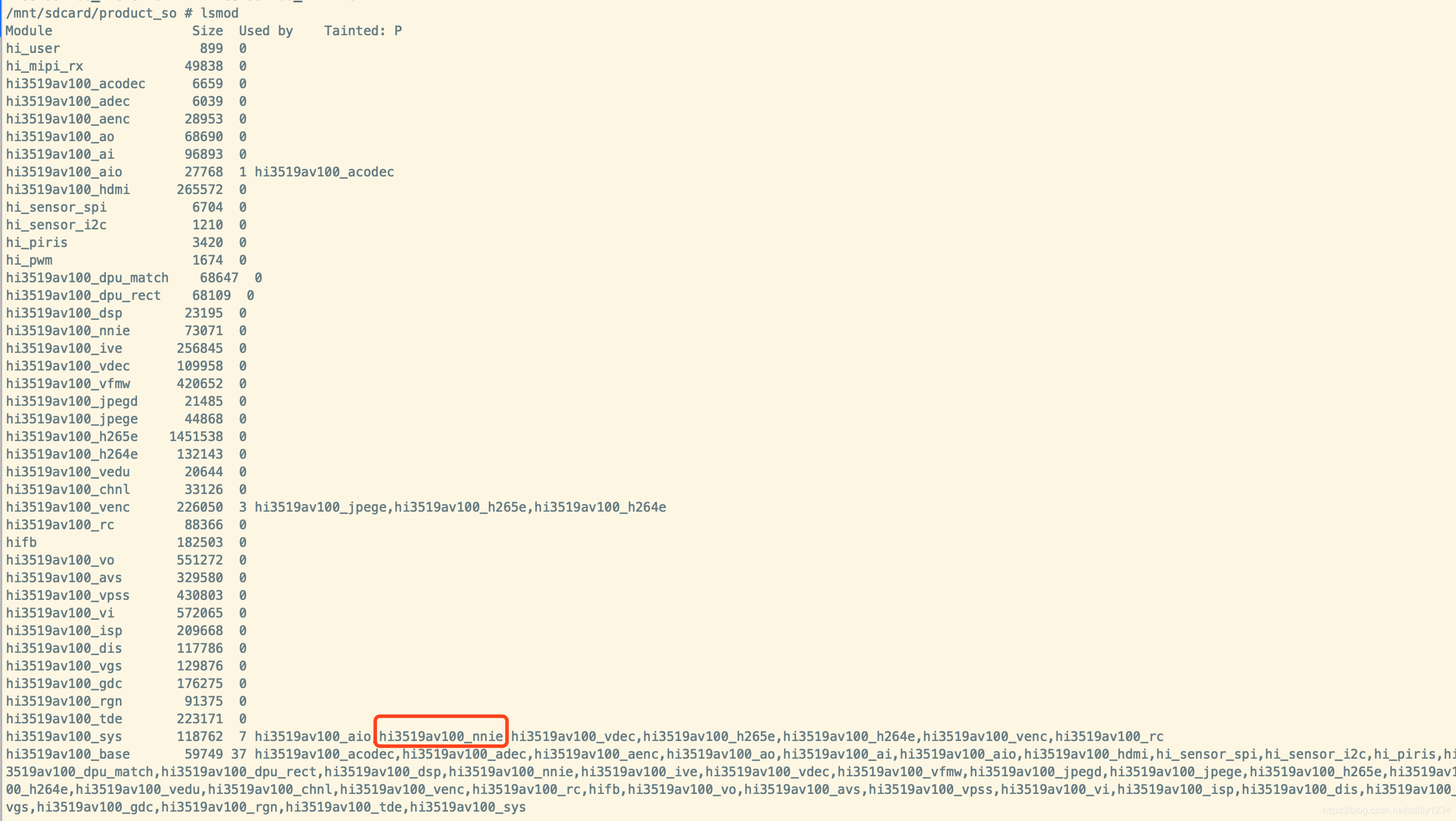 ./load3519av100 -i -sensor0 imx334 -sensor1 imx334 -sensor2 imx334 -sensor3 imx334 -sensor4 imx334 -total 2048 -osmem 256执行lsmod命令,可以查看驱动加载情况,hi3519av100_nnie 应该是跟NNIE相关的驱动,然后就可以正常运行样例程序了