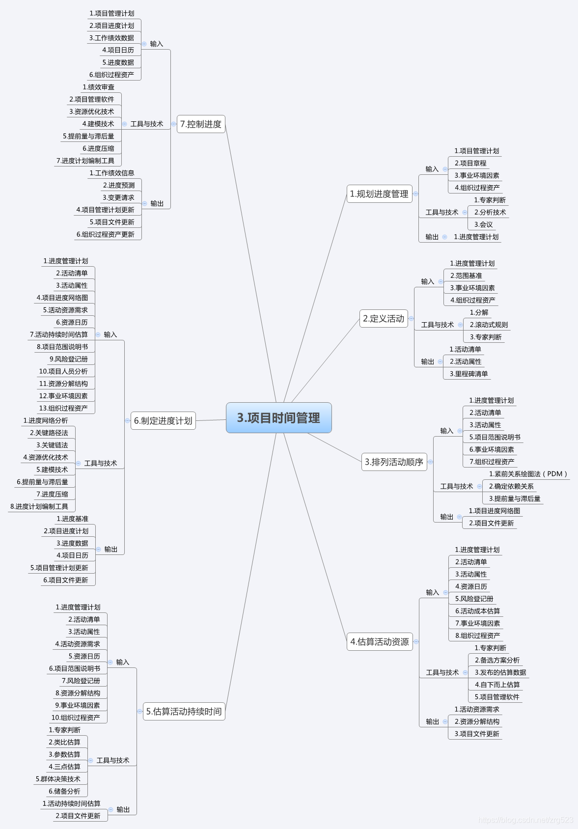 (7)定义活动:把工作包分解为可估算、可管理的活动;识别为完成项目可交付成果而需采取的具体行动的过程
