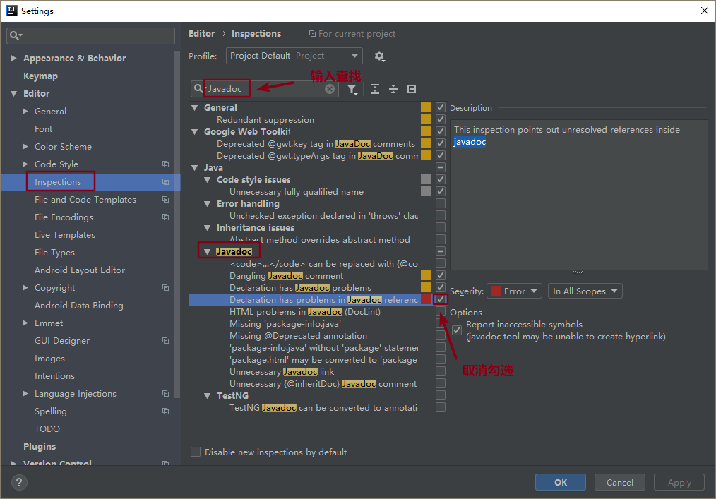 解决方法:点击菜单File-->Settings-->Inspections,找到Javadoc,取消勾选“Declaration has problems in Javadoc references”