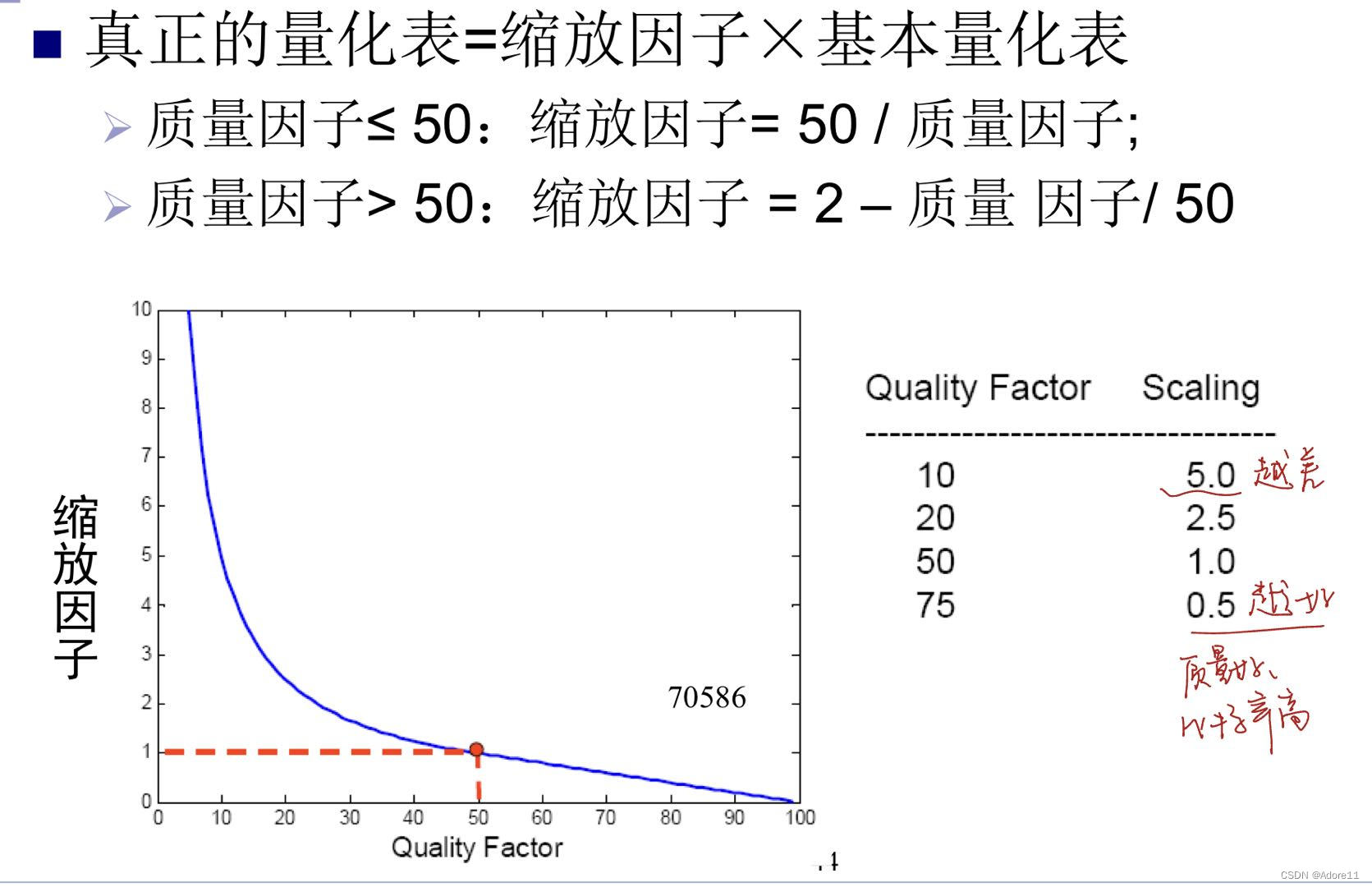 ⚪同时JPEG还引入了缩放因子,真正的量化表=缩放因子*基本量化表,质量因子越小,量化程度越深,图像质量越不好。