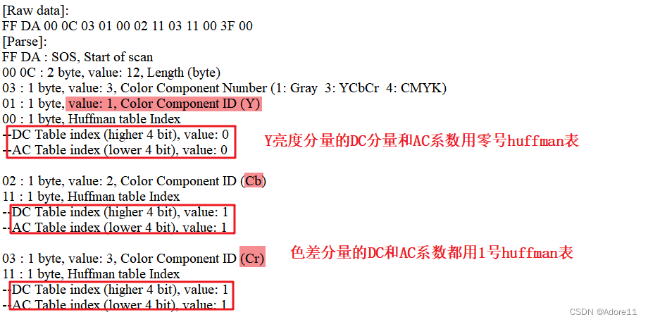 001F表长,01高四bit表示表示DC,低四bit为1号表,后续按照huffman标准化编码表示