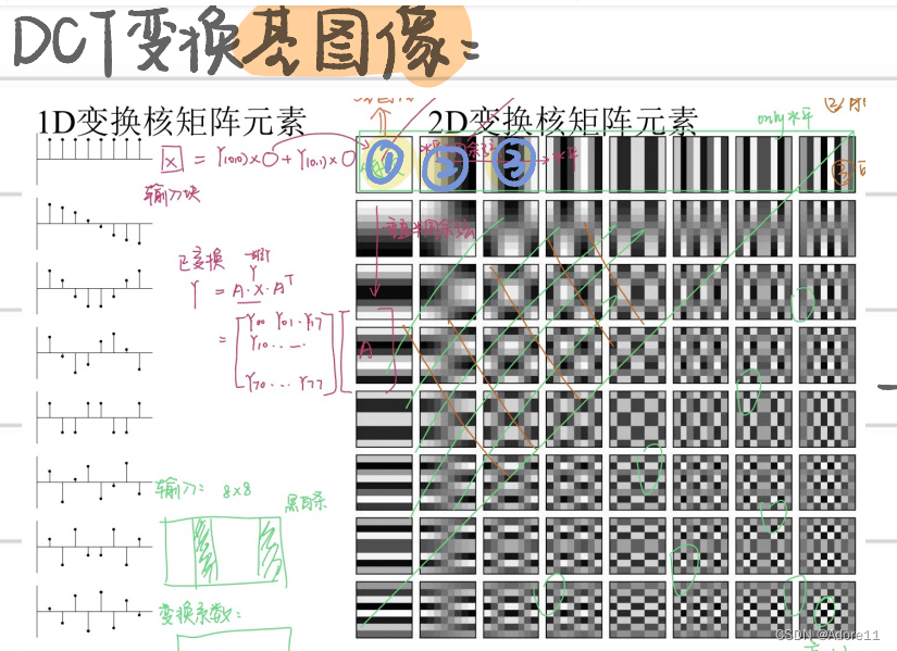 JPEG编码核心在于DCT变换(变换编码),DCT实现了能量集中、稀疏化和去相关,去除空间冗余,提高了编码效率。DCT变换后,能量大多集中在左上角,低频分量所占的能量大。