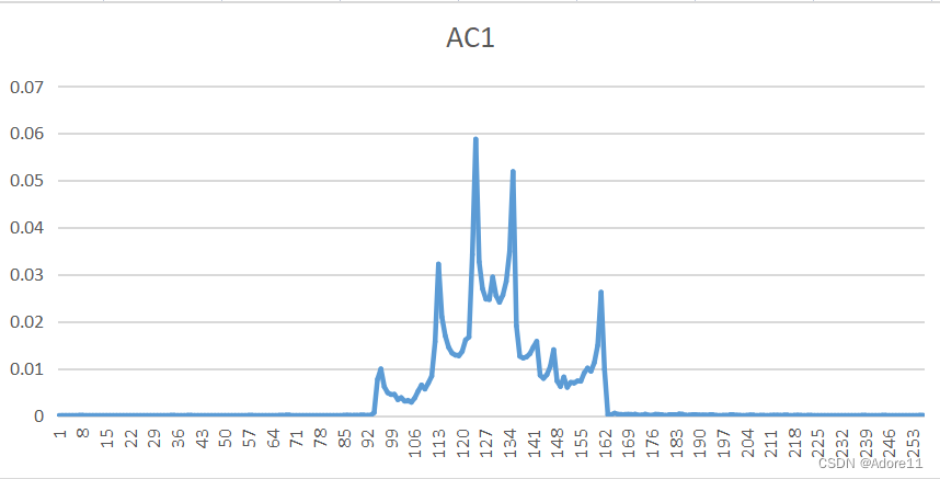 AC系数能量较小,且集中于128附近(注意我们刚开始的时候为了保证AC系数为正数,给AC系数+128,现在集中于128证明原来的AC系数集中于0附近。