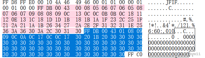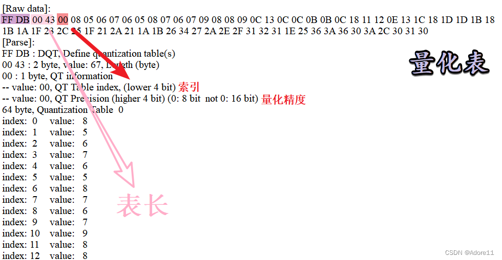 略展开说一说:JPEG中量化表也是按照之字形存储,0043表示表长,00(0表示精度,C表示index,这里是序号是0的量化表)剩下64bytes分别表示量化表的量化系数: