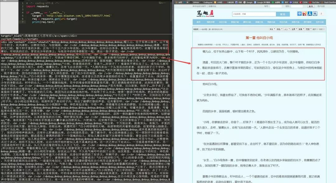 可以看到,我们很轻松地获取了 HTML 信息。但是,很显然,很多信息是我们不想看到的,我们只想获得如右侧所示的正文内容,我们不关心 div、br 这些 html 标签。如何把正文内容从这些众多的 html 标签中提取出来呢?这就是本次实战的主要内容。