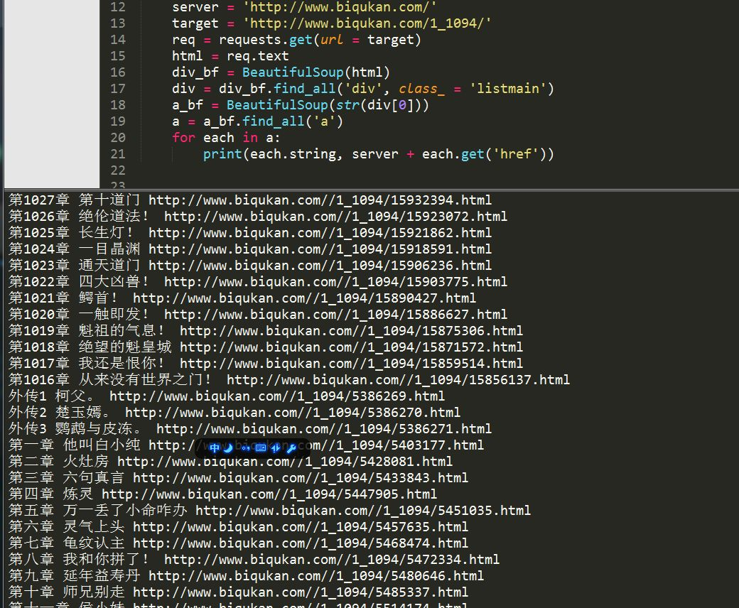方法很简单,对 Beautiful Soup 返回的匹配结果 a,使用 a.get('href')方法就能获取 href 的属性值,使用 a.string 就能获取章节名,编写代码如下: