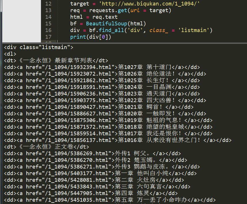 总结一下:小说每章的链接放在了 class 属性为 listmain 的<div>标签下的<a>标签中。链接具体位置放在 html->body->div->dl->dd->a 的 href 属性中。先匹配 class 属性为 listmain 的<div>标签,再匹配<a>标签。编写代码如下: