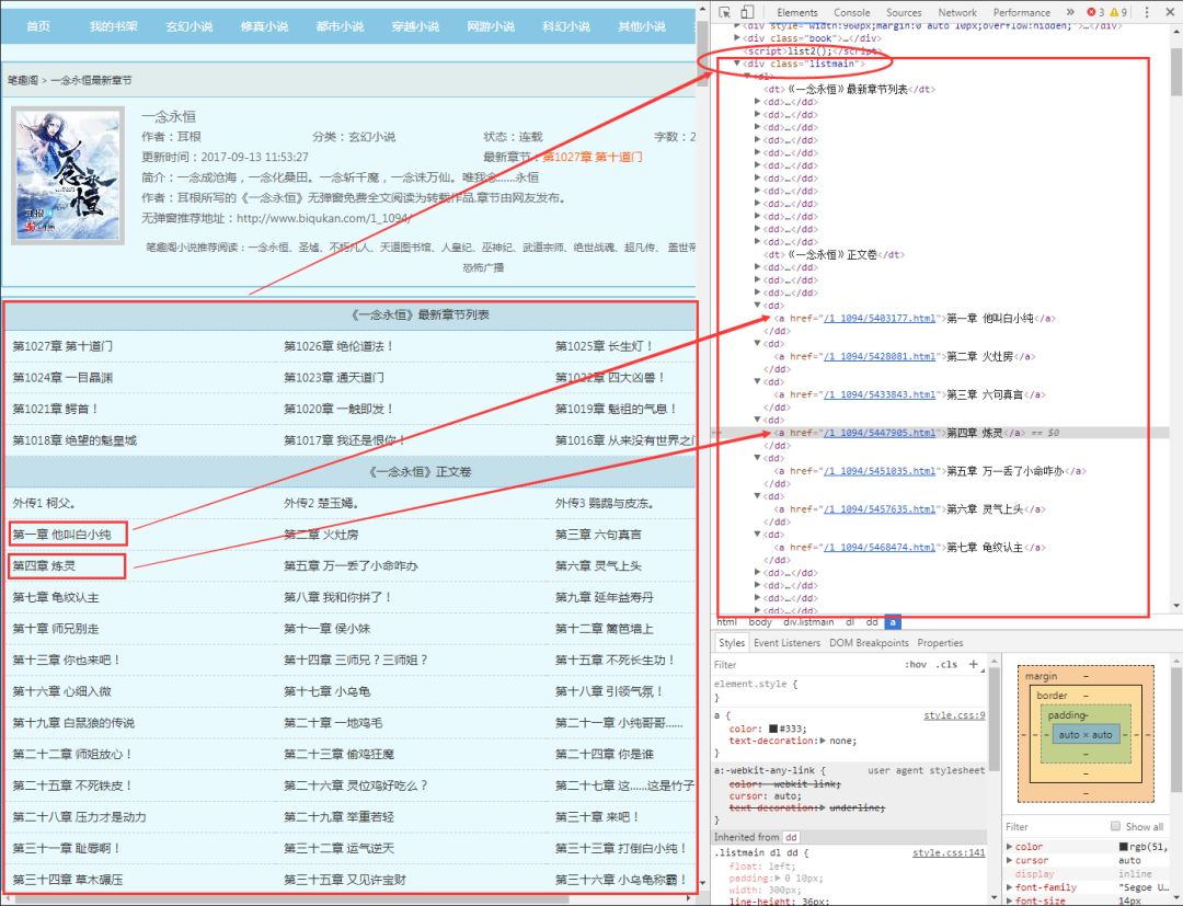 可以看到,我们很自然的匹配到了所有正文内容,并进行了分段。我们已经顺利获得了一个章节的内容,要想下载正本小说,我们就要获取每个章节的链接。我们先分析下小说目录:URL:http://www.biqukan.com/1_1094/