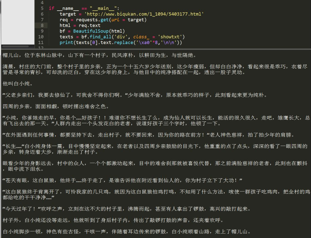 这样对应的看一下,是不是就懂了?可能有人会问了,为什么不是find_all('div', id = 'content', class_ = 'showtxt')?这样其实也是可以的,属性是作为查询时候的约束条件,添加一个class_='showtxt'条件,我们就已经能够准确匹配到我们想要的标签了,所以我们就不必再添加 id 这个属性了。运行代码查看我们匹配的结果: