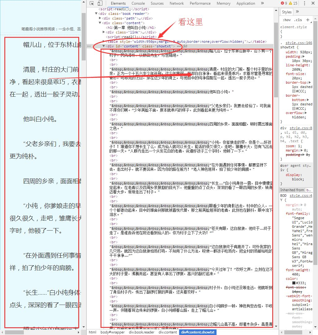 仔细观察目标网站一番,我们会发现这样一个事实:class 属性为 showtxt 的 div 标签,独一份!这个标签里面存放的内容,是我们关心的正文部分。