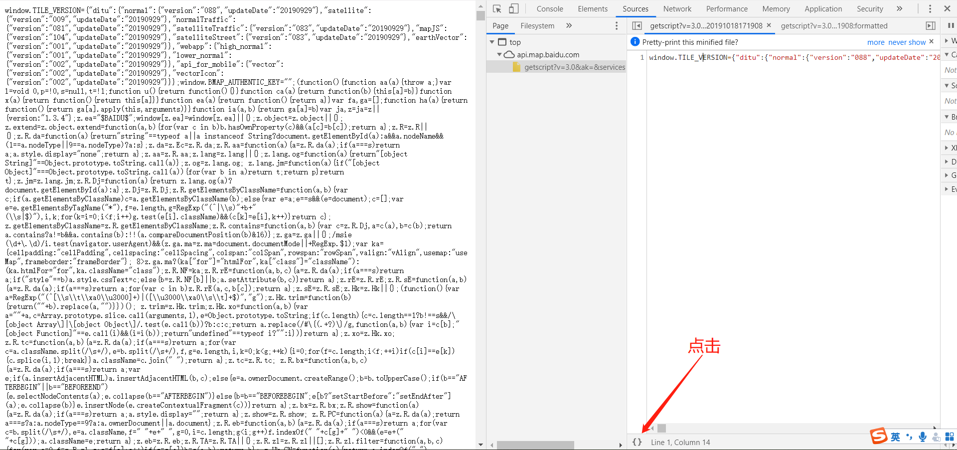 访问这个地址http://api.map.baidu.com/api?v=3.0 ,这个是引入在线js文件时的地址,打开之后是一段代码,在代码中找到 src = "http://api.map.baidu.com/getscript?v=3.0&ak=&services=&t=20191018171908" ,打开这个地址,就可以看到压缩后的js代码,把这些代码粘下来,保存到本地上,就先保存在bmap_offline_api_v3.0_min.js文件里。在粘代码之前可以先格式化一下,以便下面查看与修改,利用谷歌浏览器自带的pretty print(就是下面那个红圈里的大括号工具)就可以,将格式化好的代码粘下来保存。