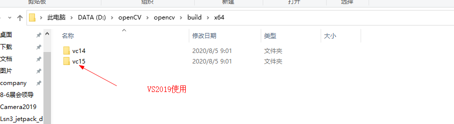 这里我安装到D:\openCV ,安装完成后进入安装目录,看到 D:\openCV\opencv\build\x64 有 vc14和vc15两个文件夹。 vs2019使用的是vc15这个目录的东西。