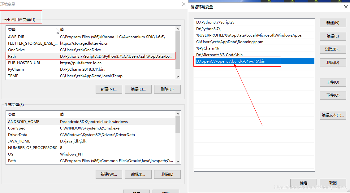 右键 计算机-属性-高级系统设置-环境变量,将 openCV安装目录下\opencv\build\x64\vc15\bin 配置到用户环境变量。