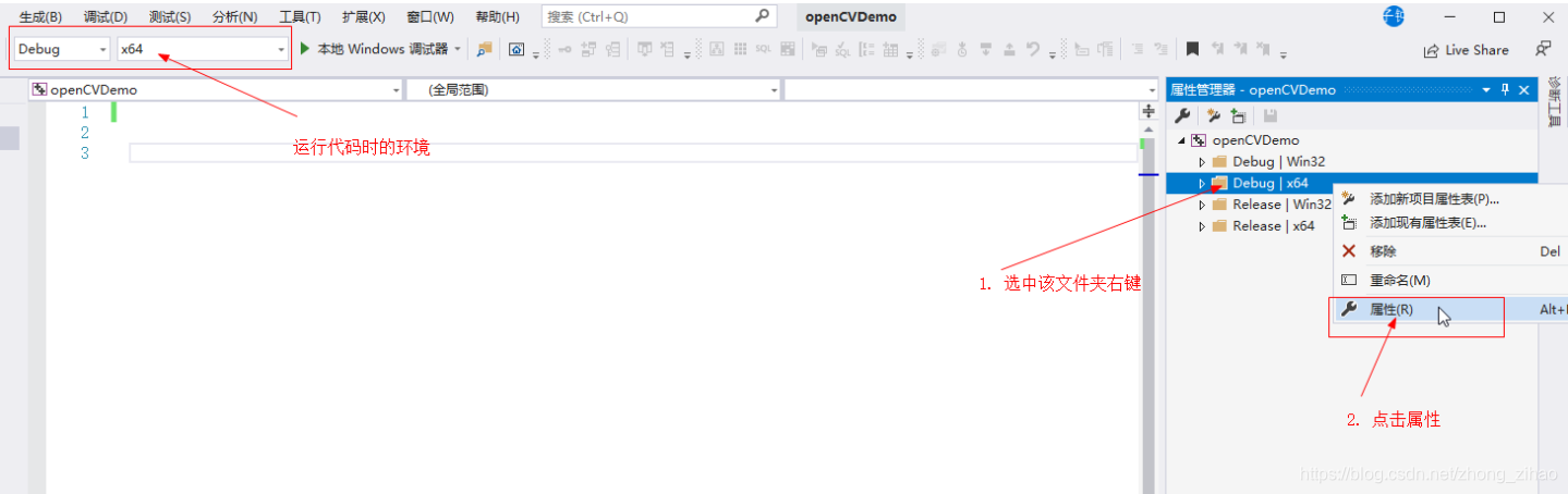 (2)可以看到右侧显示了属性管理器,在win10 64位系统里,选择Debug x64的文件夹,右键-属性 打开配置