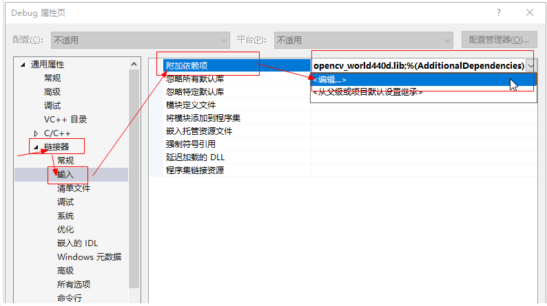 回到vs 选择 链接器--输入--附加依赖项--编辑 添加依赖项