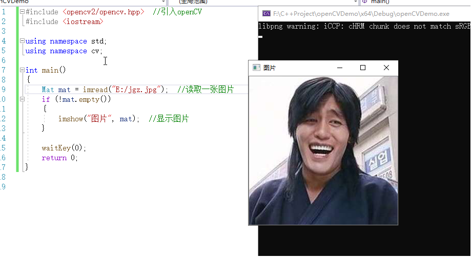 Mat mat = imread("E:/jgz.jpg"); //读取一张图片