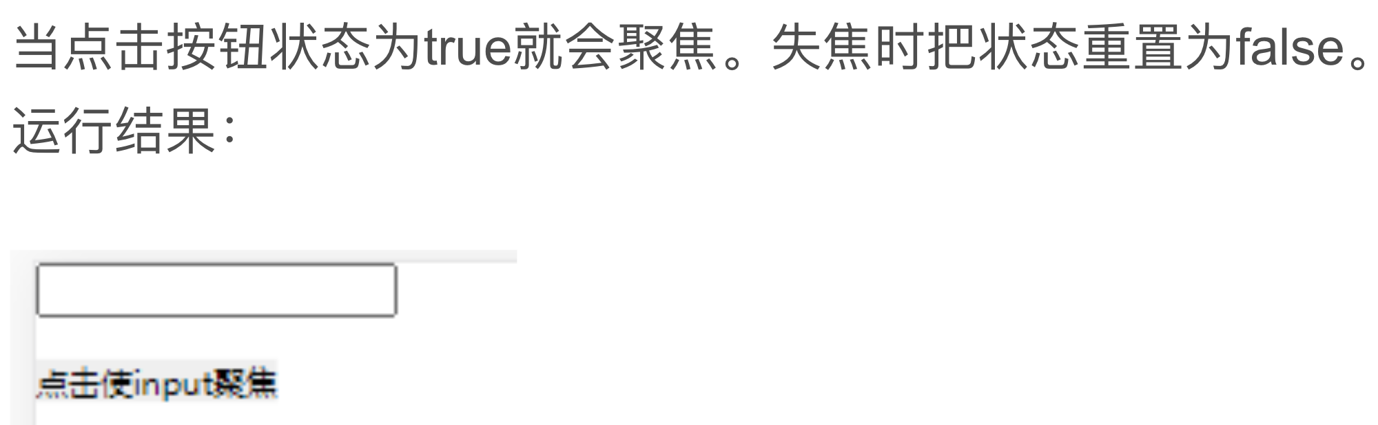 <template> <div class="box"> <input type="text" ref="ipt"> <br> <button @click="btn">点击使input聚焦</button> </div> </template> <script > export default{ methods:{ btn(){ this.$refs.ipt.focus() } } } </script>当点击聚焦按钮时,使其上面的 input 框实现 聚焦 。