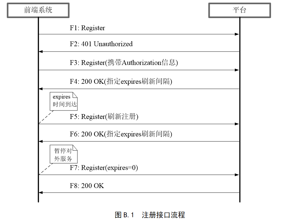 - 前端系统上线后,应向其已配置的隶属平台发起注册过程,告知自己的设备编号和信令地址。如注册失败,须周期性(30s)地重新尝试注册,直至注册成功。在向平台注册过程中,不应影响前端系统对内提供监控业务的能力。