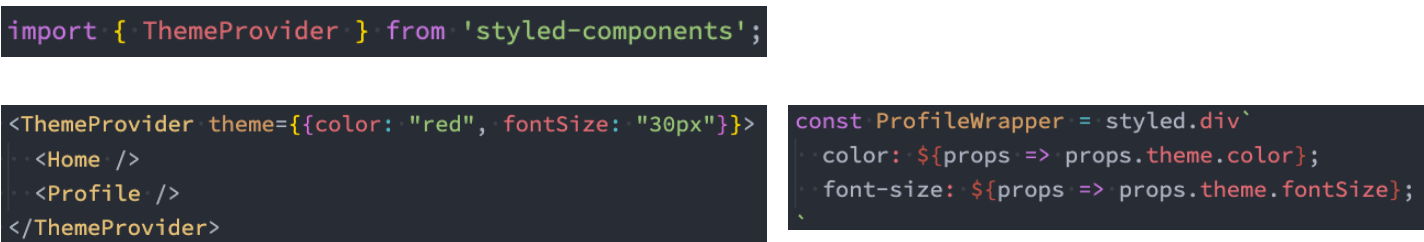 <ThemeProvider theme={{themeColor: "red", fontSize: "30px"}}>