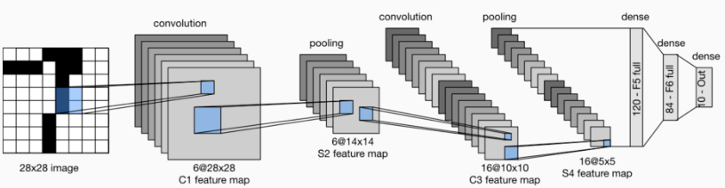 本层的输入矩阵大小为14×14×6,使用的过滤器大小为5×5,深度为16。本层不使用全0填充,步长为1。本层的输出矩阵大小为10×10×16。按照标准的卷积层,本层应该有5×5×6×16+16=2416个参数,10×10×16×(25+1)=41600个连接。