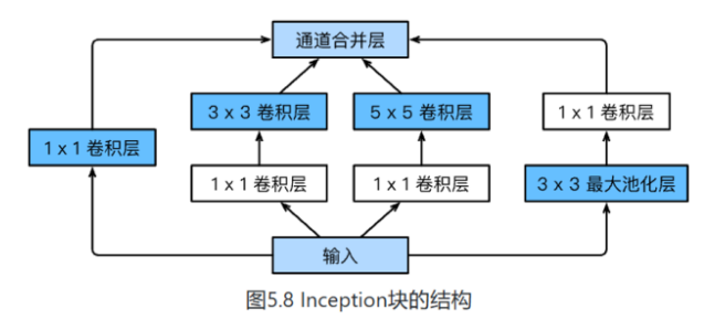 - Inception块相当于⼀个有4条线路的⼦⽹络。它通过不同窗口形状的卷积层和最⼤池化层来并⾏抽取信息,并使⽤1×1卷积层减少通道数从而降低模型复杂度。