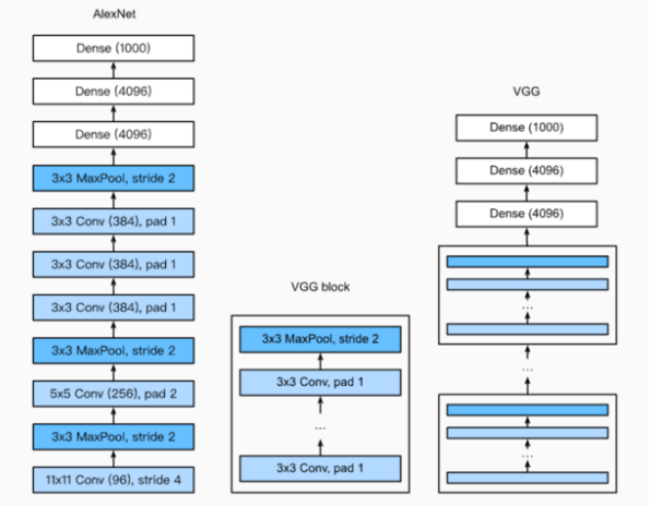 Block:数个相同的填充为1、窗口形状为3×33×3的卷积层,接上一个步幅为2、窗口形状为2×22×2的最大池化层。