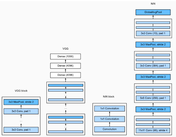 NiN:LeNet、AlexNet和VGG:先以由卷积层构成的模块充分抽取 空间特征,再以由全连接层构成的模块来输出分类结果。