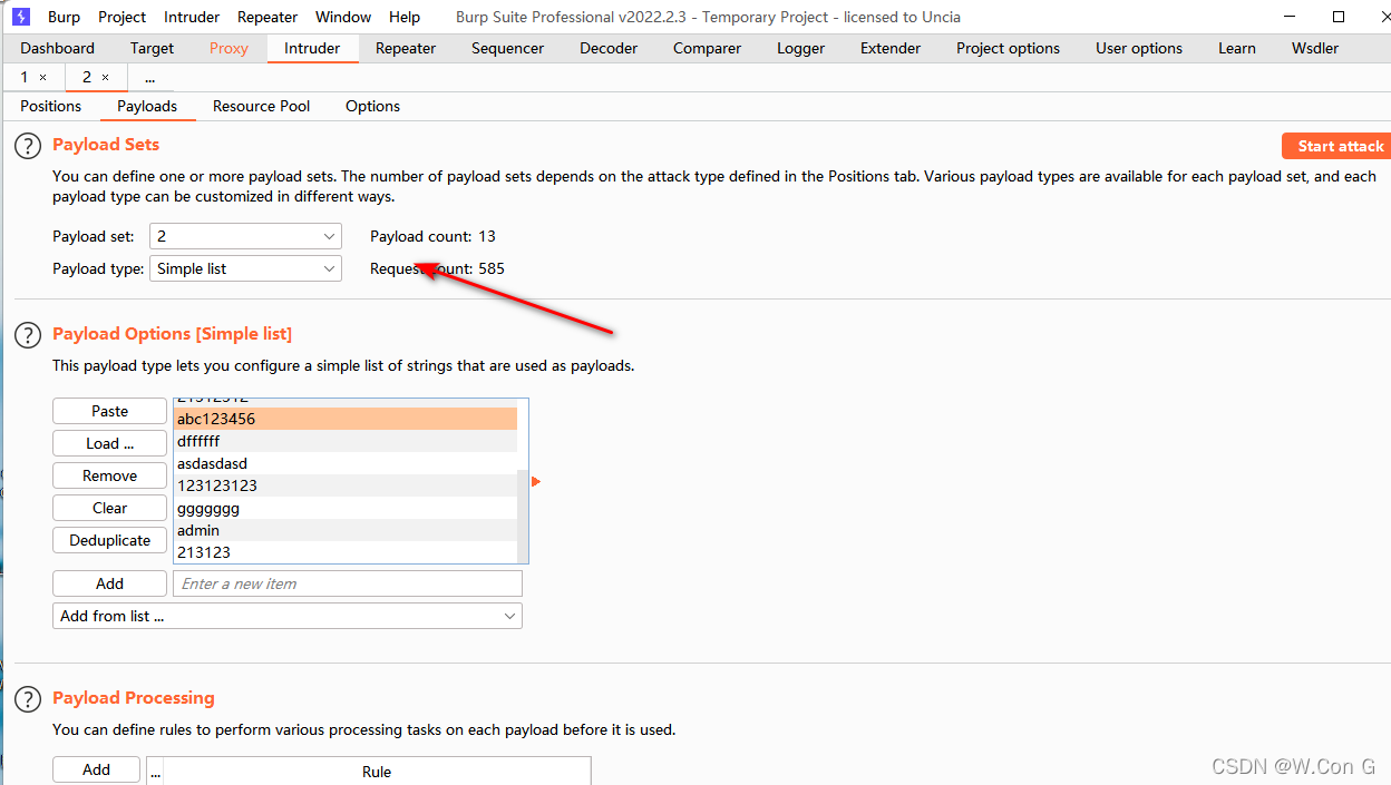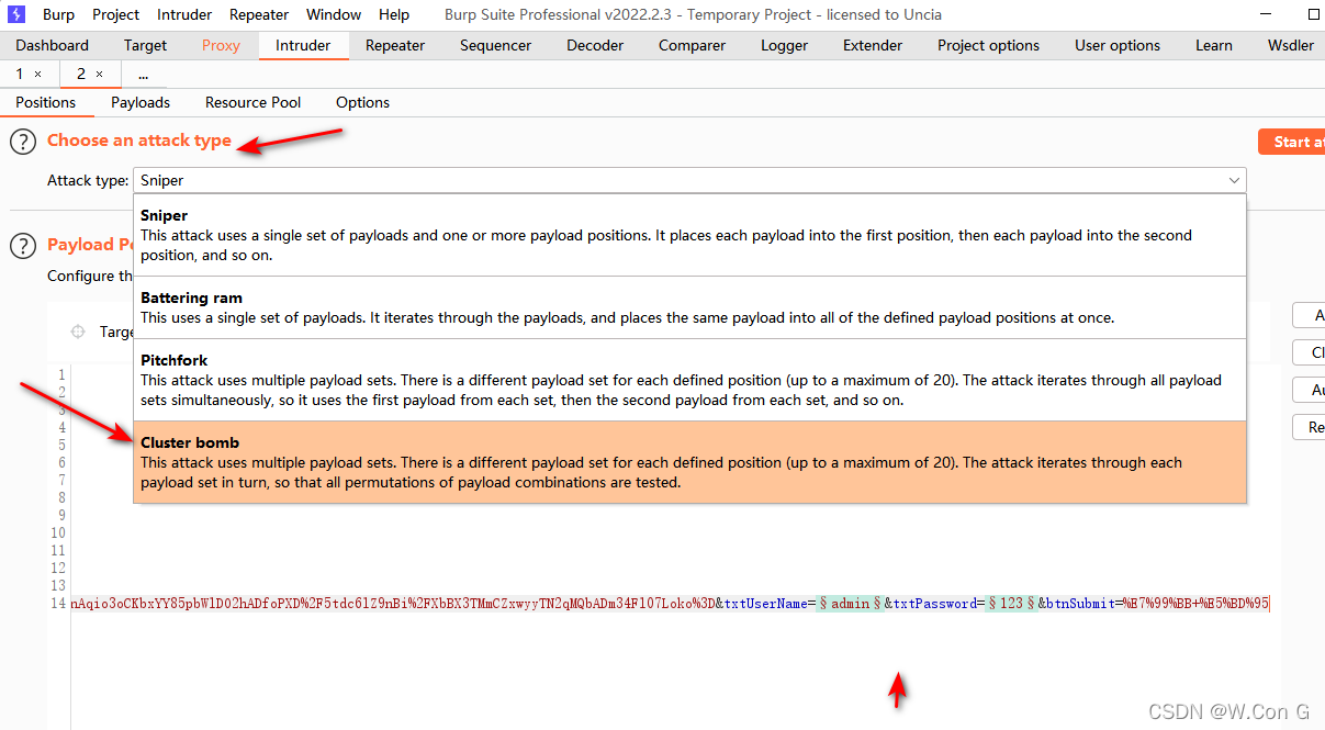 2、接着设置两个需要变更的参数 ,Attack type类型选择Cluster bomb
