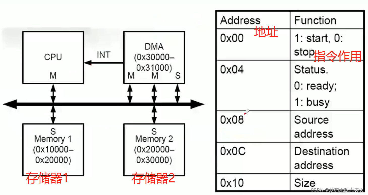 步骤:其中,图中的M、S表示master、slave。图中DMA到CPU箭头上的INT的意思是中断。