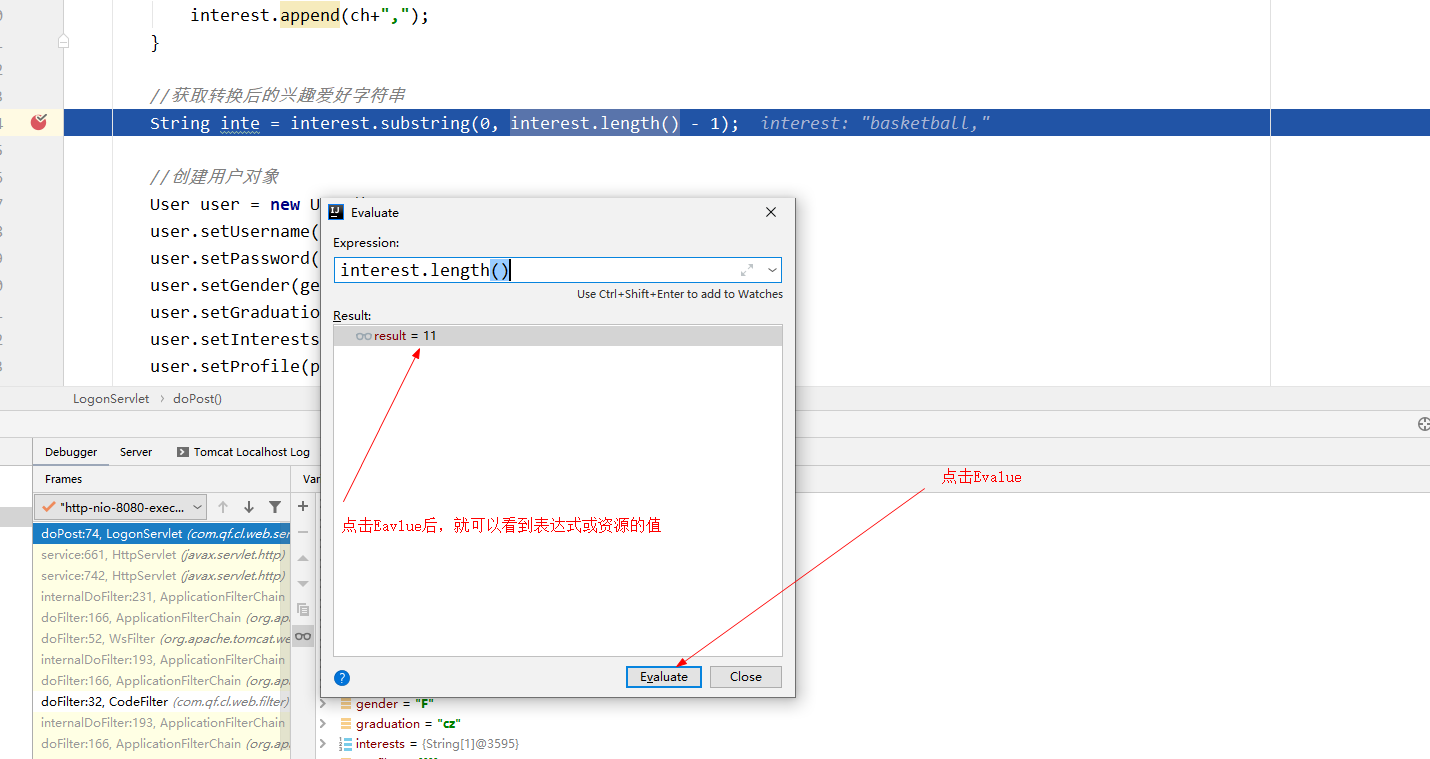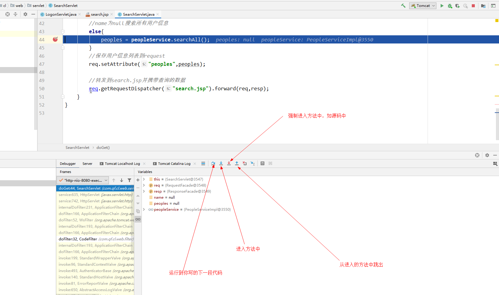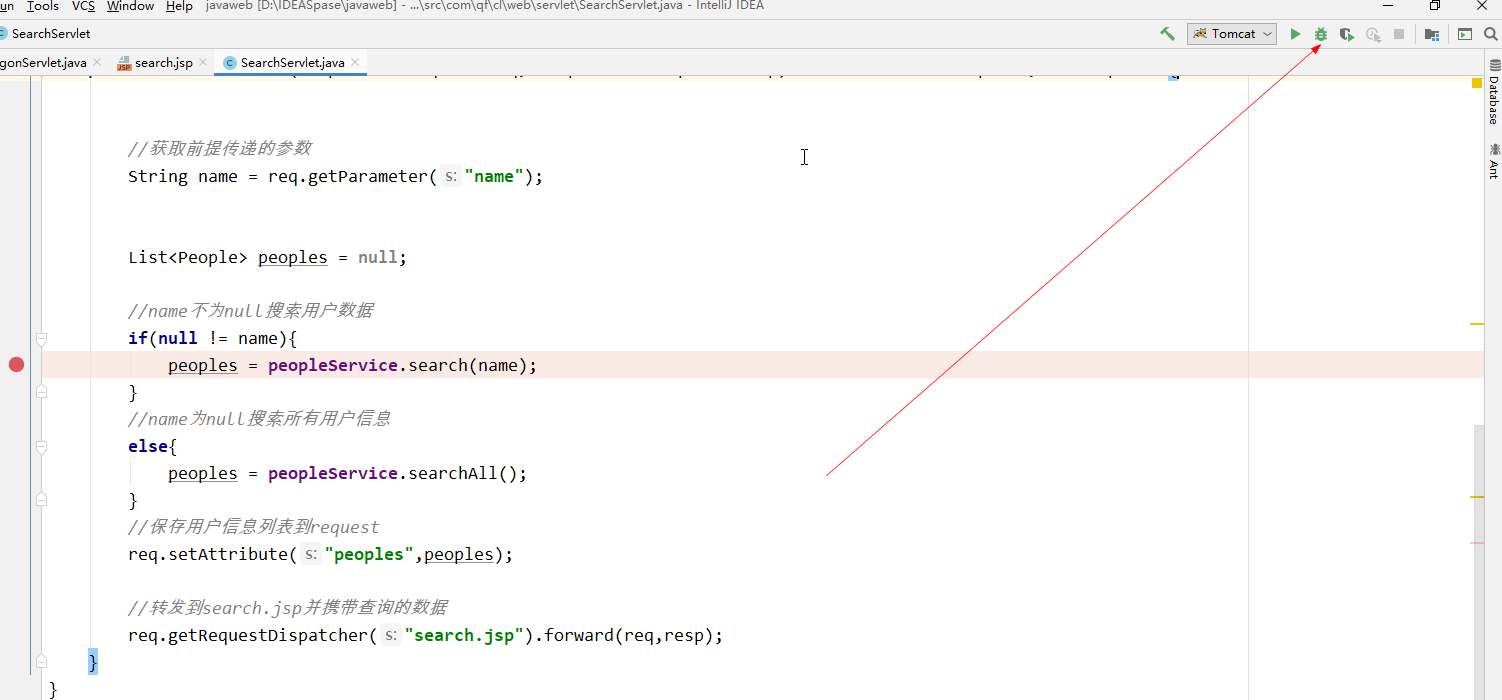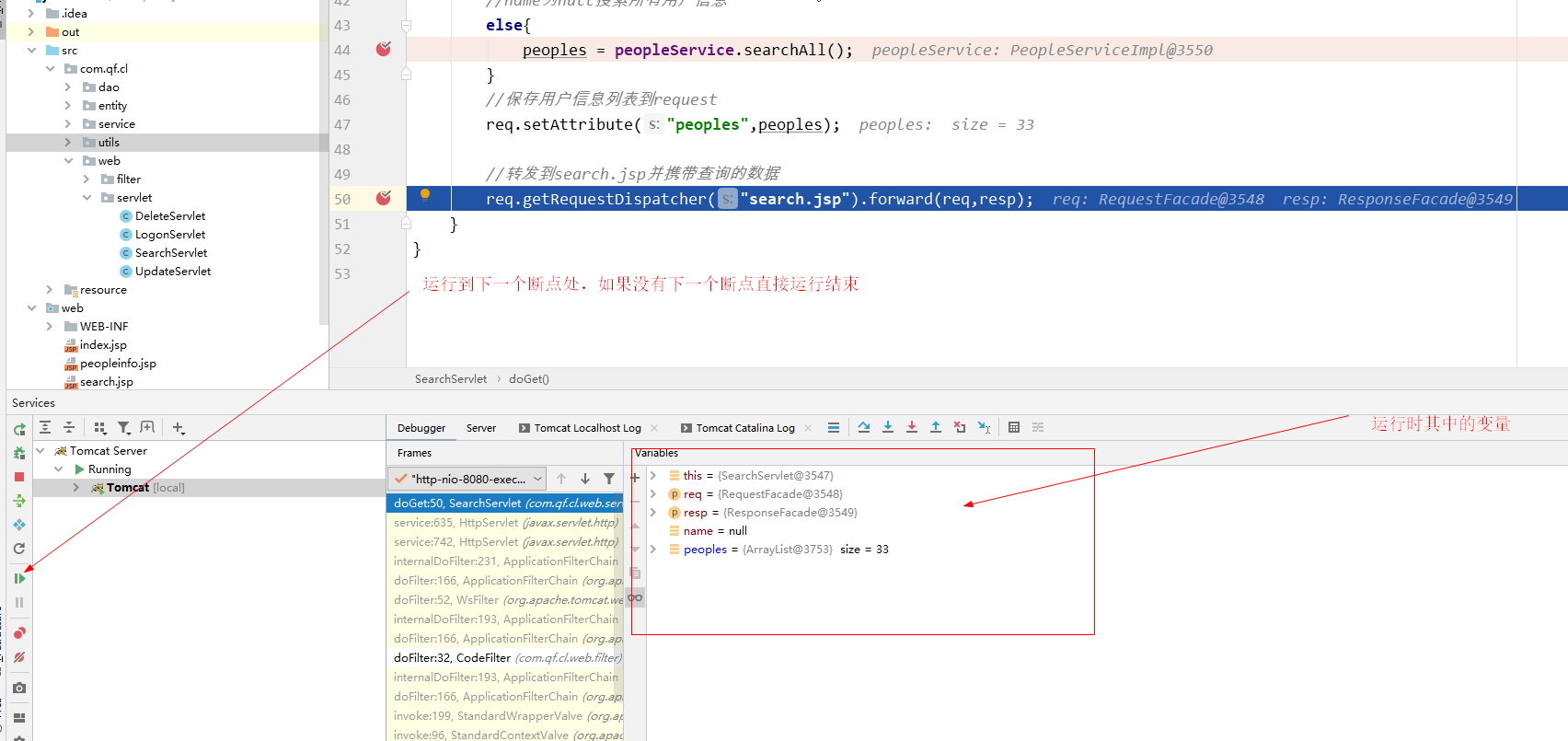 步骤五:如下图单击图中说明的按钮可将代码运行到下一个断点处,IDEA还提供了变量视图窗口方便查看变量情况