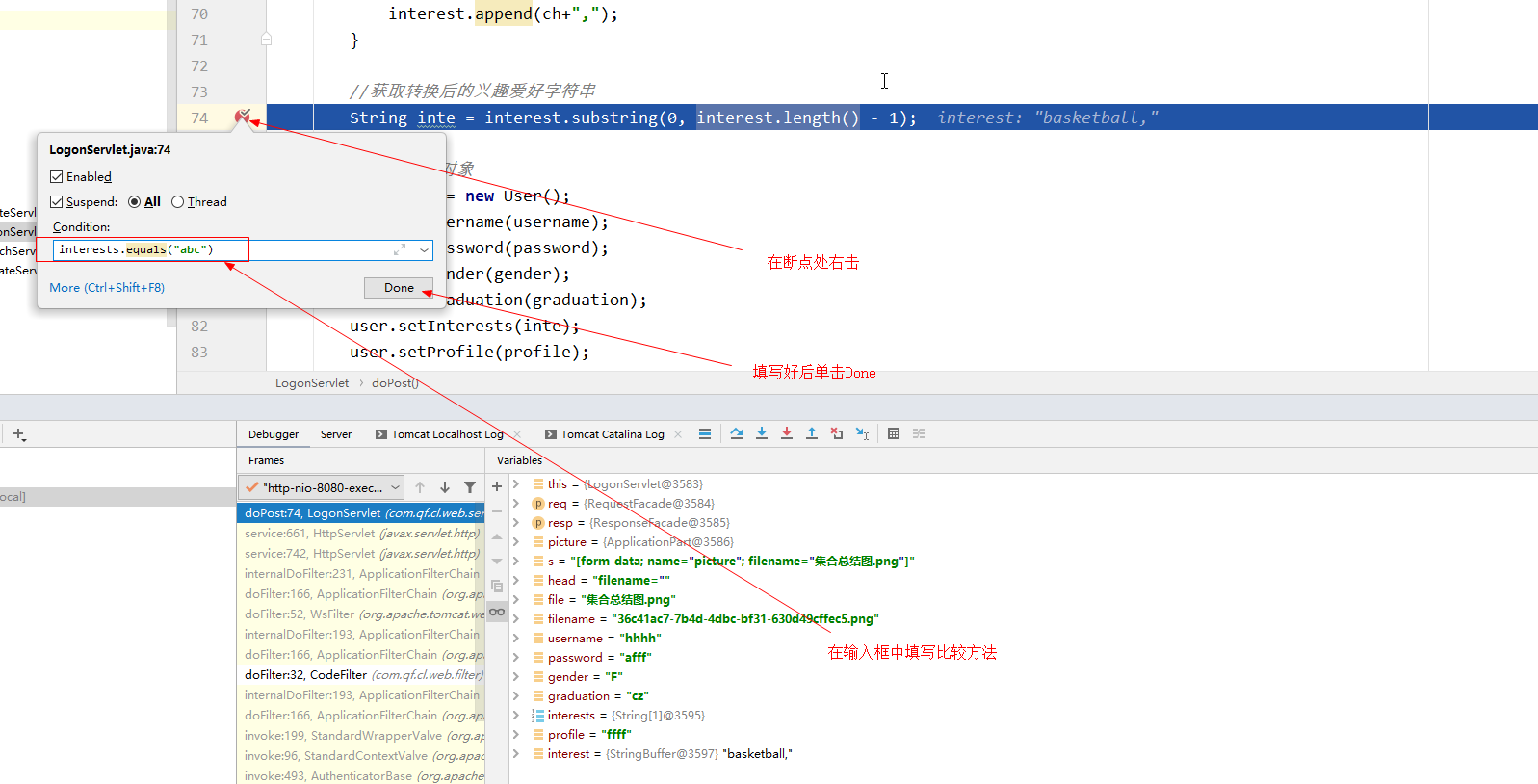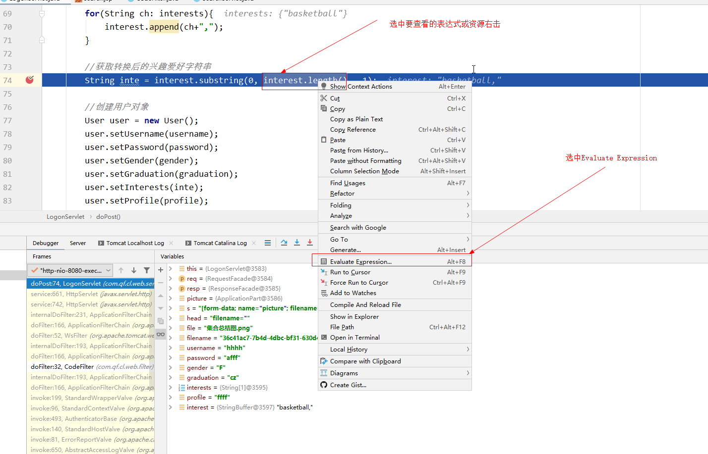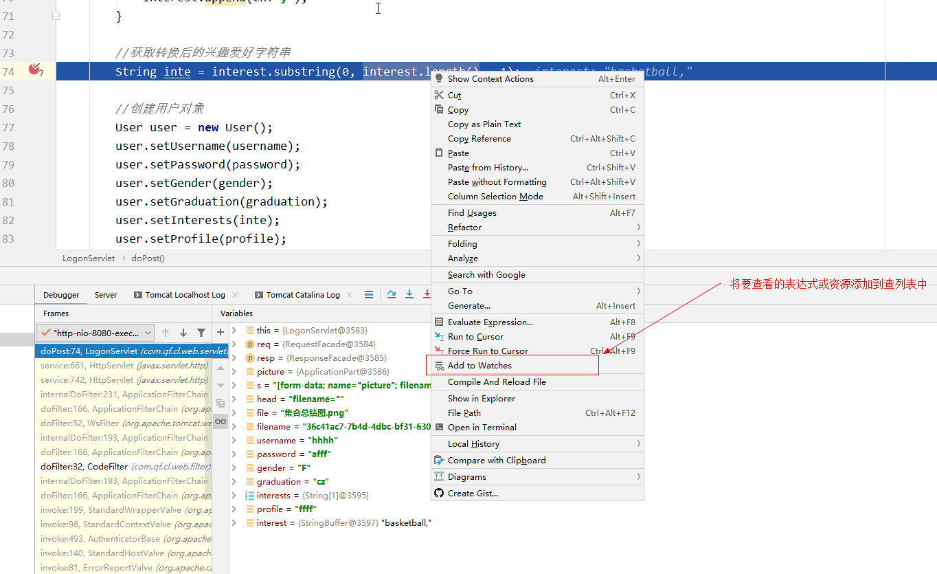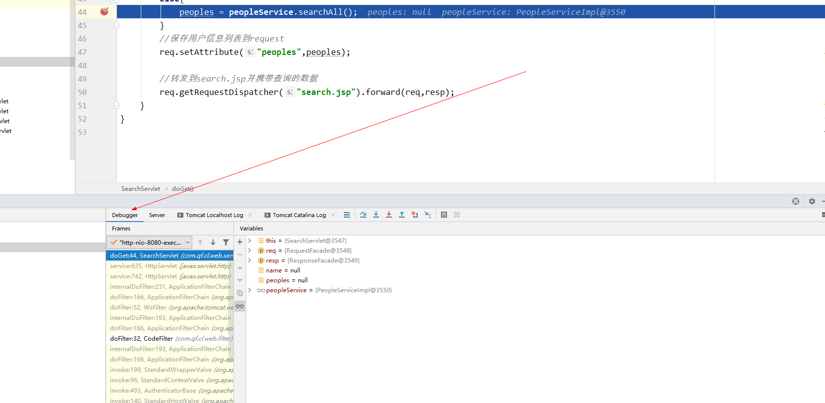步骤五:如下图单击图中说明的按钮可将代码运行到下一个断点处,IDEA还提供了变量视图窗口方便查看变量情况