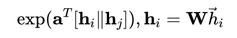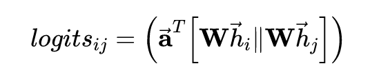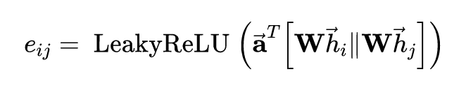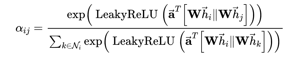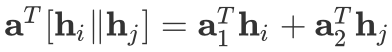 注意力网络可以有很多的设计方式,这里作者将节点和的表示进行了拼接,再映射为一个标量。需要注意,这里拼接导致,也就是说注意力值是非对称的。