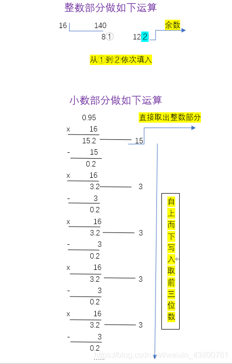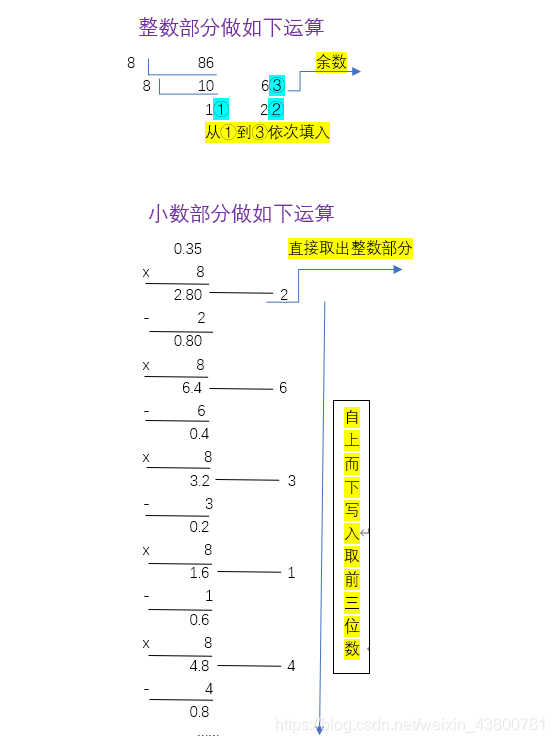 规律:十进制转换成相应进制的数字,整数部分除以对应进制取余,在除以进制在取余,依次计算下去,然后按照从下到上而写;小数部分则是乘以对应进制取整数,然后依次再乘以进制数,再取整数,有的可能无限位数,则取前三位,由上到下!