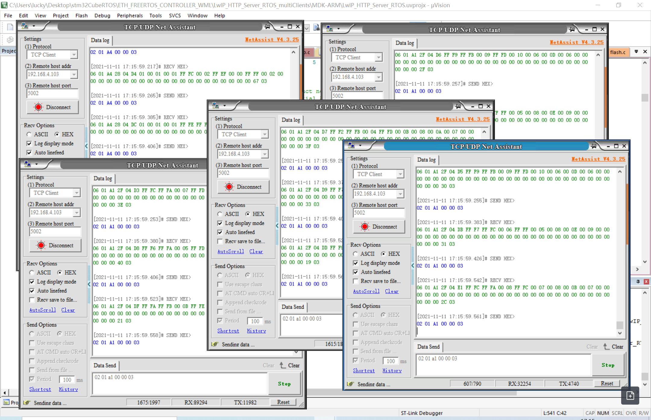 后又发现在连接第五个连接时出现连接失败的情况,调用堆栈使用情况发现在建立第五个连接的时候剩于堆栈空间不足,因此调整freeROTSConfig.h的堆大小,且运行后保证有一定冗余,运行正常