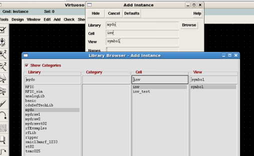 新建一个Cell 并命名为inv_test,打开原理图,按快捷键i,选择反相器的封装,将封装导入inv_test原理图内