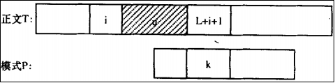 假设在发生不匹配时T[i] ≠ P[j](0≤i<N, 0≤j<m), 此时已经匹配的部分字串问为u,并假设子串u的长度为L.如下图.