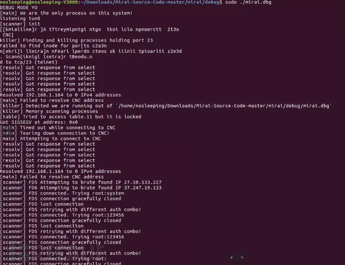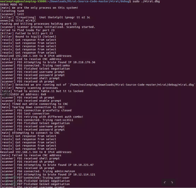 电脑A:作为第一个被感染的设备。在48101端口运行./mirai.dbg进行扫描爆破。