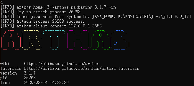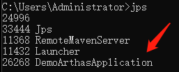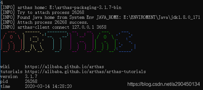 - 启动arthas工具,-jar 方式进行启动,这里第四个进程是demo进程,输入4然后回车