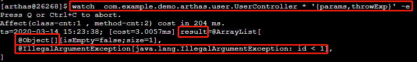 watch com.example.demo.arthas.user.UserController * '{params,throwExp}' -e