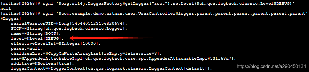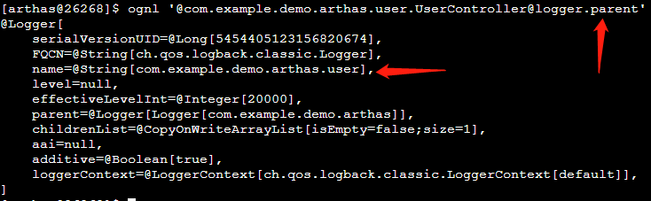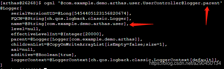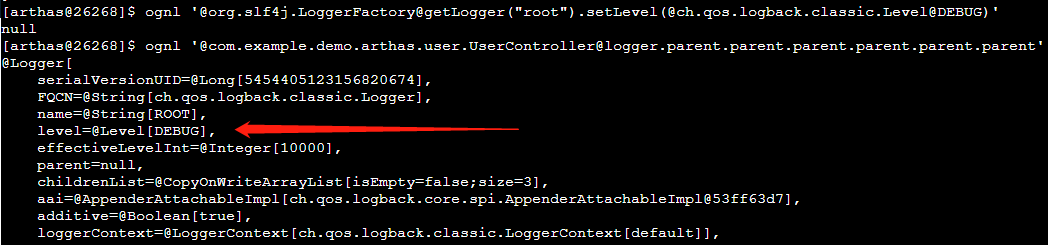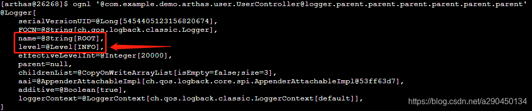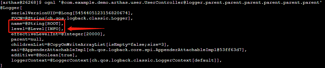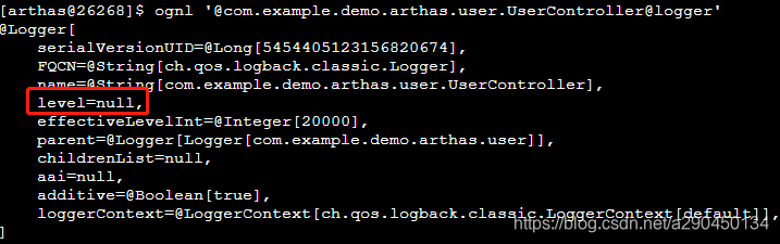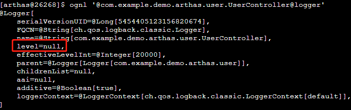 ognl '@com.example.demo.arthas.user.UserController@logger'再此可以看到实现方式是通过logback,日志级别是空。要找到日志级别就需要继续向上。